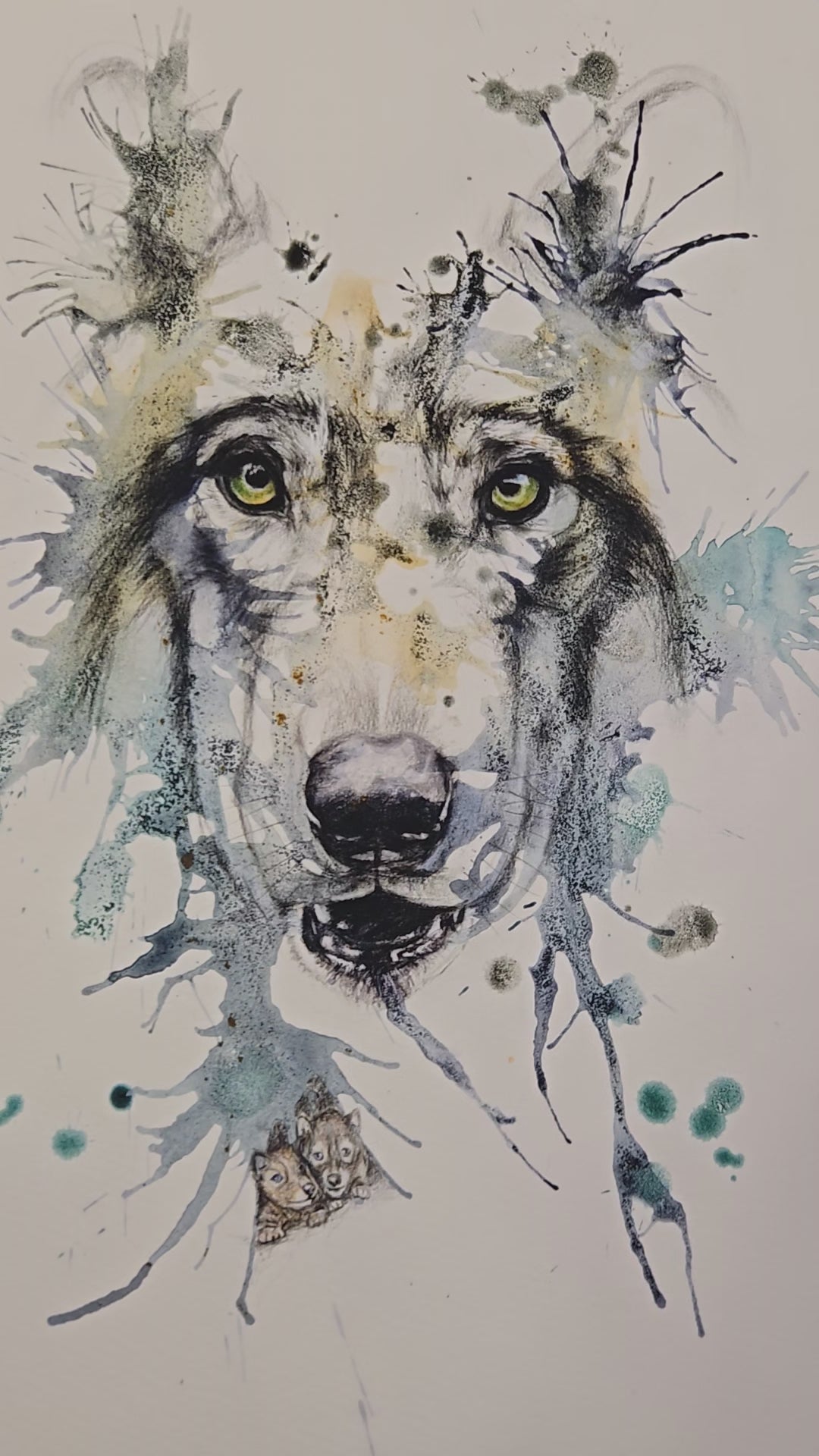 I particularly like the expression on this wolf. All too often, they are depicted as menacing creatures mainly as a result of fairy tales such as Snow White. We are in a situation where it could be argued, we need wolves back in the UK because of the excessive deer population. I wanted to show the caring nature of the wolf in this picture and the colour tones are calming too.